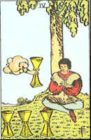 Das Motiv der Karte zeigt einen Mann, der mit verschränkten Armen und Beinen unter einem Baum sitzt. Vor ihm stehen drei Kelche, ein vierter wird ihm aus einer kleinen Wolke gereicht, doch er nimmt nichts davon wahr. Es scheint, als will er die Chancen, die ihm das Leben aktuell bietet, nicht sehen.
